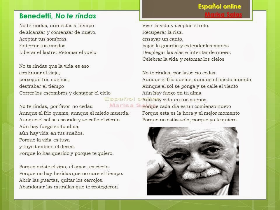 ¿Conoces a Mario Benedetti? Fue un escritor, poeta y ensayista uruguayo. Escribió más de ochenta libros, algunos de los cuales han sido traducidos a más de veinte idiomas. Aquí tienes uno de sus poemas, titulado No te rindas. Espero que te guste.