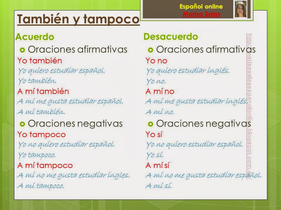 Usamos las expresiones también y tampoco para expresar acuerdo. Sin embargo, expresamos desacuerdo con expresiones como yo sí y yo no. Mira la siguiente imagen. Espero que te resulte útil.