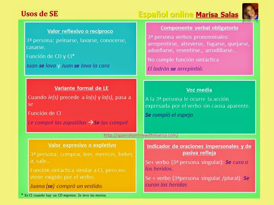 Hoy voy a explicar brevemente los principales usos de SE como pronombre personal y como indicador de oraciones impersonales y de pasiva refleja. Mira la foto.