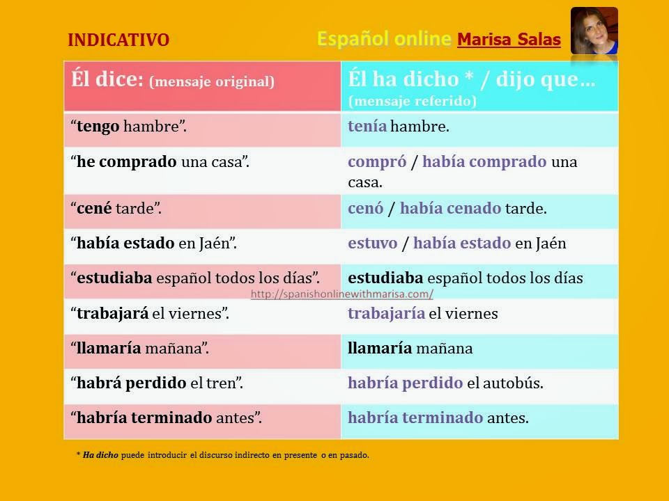 Cuando transmitimos un mensaje de otra persona, los tiempos verbales originales pueden cambiar. Si el verbo introductor (decir, contar, afirmar, preguntar, etc) va en presente no se producen cambios (salvo en imperativo), pero si va en pasado es necesario realizar una serie de transformaciones. En Indicativo son estas:
