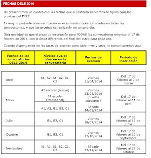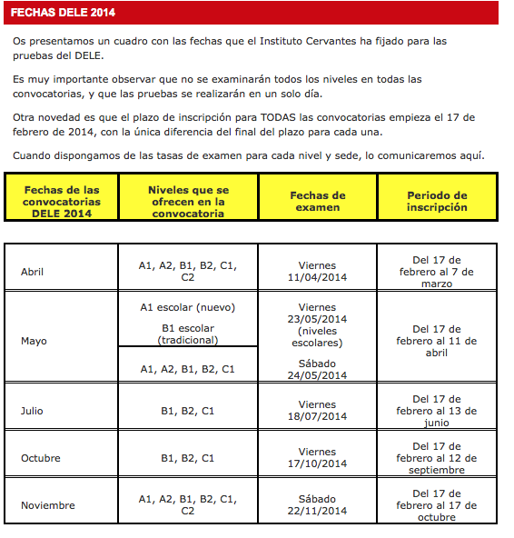 El Instituto Cervantes ya ha publicado las fechas de los exámenes DELE para el próximo año. En 2014 habrá cinco convocatorias. Hay que estar preparados. Mucho ánimo.